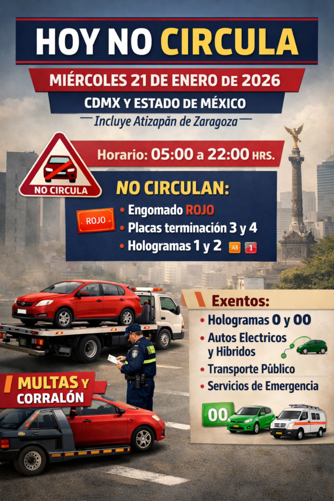Ciudad de México / Estado de México. Miércoles 21 de enero de 2026 — Desde las 05:00 hasta las 22:00 horas, la Comisión Ambiental de la Megalópolis (CAME) mantiene activas las restricciones del programa Hoy No Circula en la Zona Metropolitana del Valle de México, incluyendo la Ciudad de México y municipios conurbados del Estado de México como Atizapán de Zaragoza.