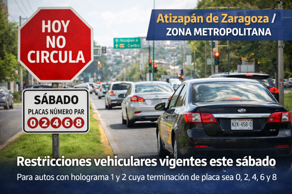 Como parte de las medidas ambientales para disminuir los niveles de contaminación en la Zona Metropolitana del Valle de México, autoridades confirmaron que este sábado 24 de enero se mantendrán activas las restricciones del programa Hoy No Circula, las cuales también aplican para municipios del Estado de México, entre ellos Atizapán de Zaragoza.