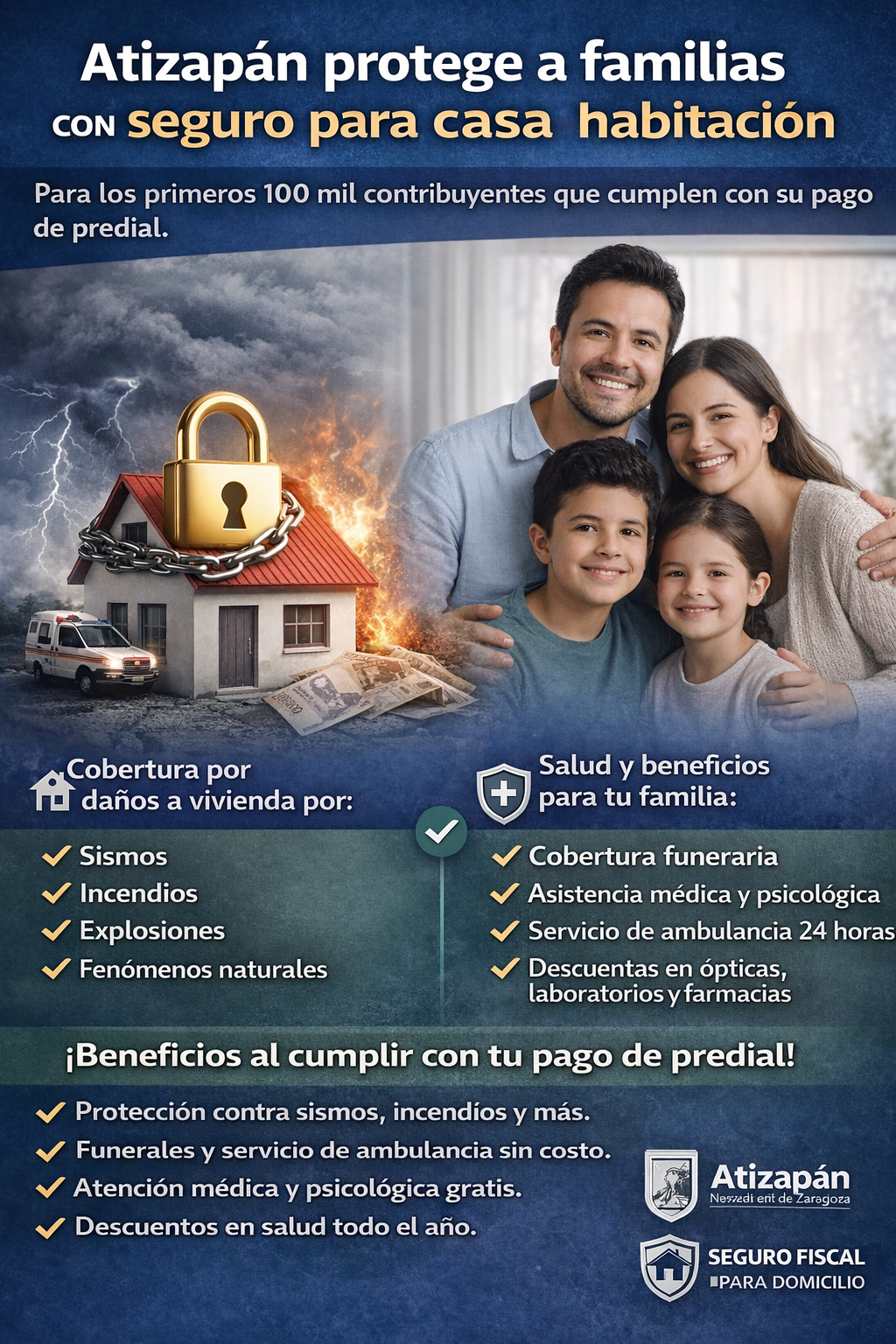 El Gobierno de Atizapán de Zaragoza continúa ofreciendo un seguro para casa habitación dirigido a los primeros 100 mil contribuyentes que realizan puntualmente el pago del impuesto predial, integrando beneficios…